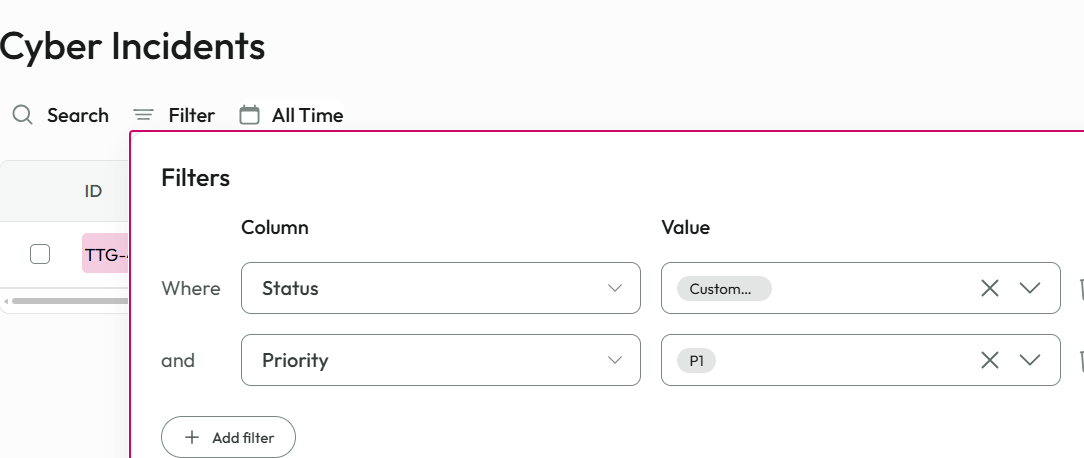 As an example, reviewing Cyber Incidents which are either in Customer Action OR have a P1 priority.